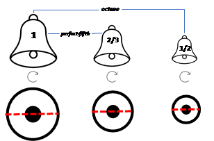 The story goes something like this: Pythagoras was chilling in his yard one afternoon when one of his friends showed up with a gift. He was a musician and was making room for new gear so he thought his buddy Pythagoras would enjoy having a nice sized bell. Pythagoras was overjoyed (always secretly wanting to be a musician) and thanked his friend very much. While he enjoyed listening to the deep resonant sound that emanated from within the object as he struck, he couldnt help but wonder why it made that particular sound. So, being a math guy, he started taking measurements and running tests. He went back to his workshop and made a bell exactly half () the size of the original. When he struck both at the same time, both bells produced the same note just the small one was higher than the larger one. That day he discovered what we call an octave and sure enough if he made a bell twice the size of the original, he would have heard the same note but a level lower (Figure 1).