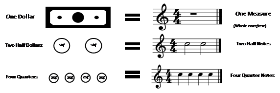 Figure 4: Analogy of how a Dollar is divided into Cents relates to how a Measure of music is divided