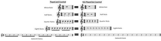 Again, a careful eye will be able to follow how each note or rest divides by 2 as one reads downwards in Figure 5. One may also notice after quarter notes/rests, the next smaller value is eighth notes/rests, and even furthermore, the smaller value after that are sixteenth notes/rests. Where a dollar stops dividing by 2 after quarters, musical notation stops dividing by 2 at the sixty-fourth note! However, a note that small is rarely used, only on special occasions when you need to play something really fast. Thus, Figure 5 only intends to demonstrate the continuous breakdown of a whole value to a sixteenth value to give you an idea of how a measure is divided into proportionate values.